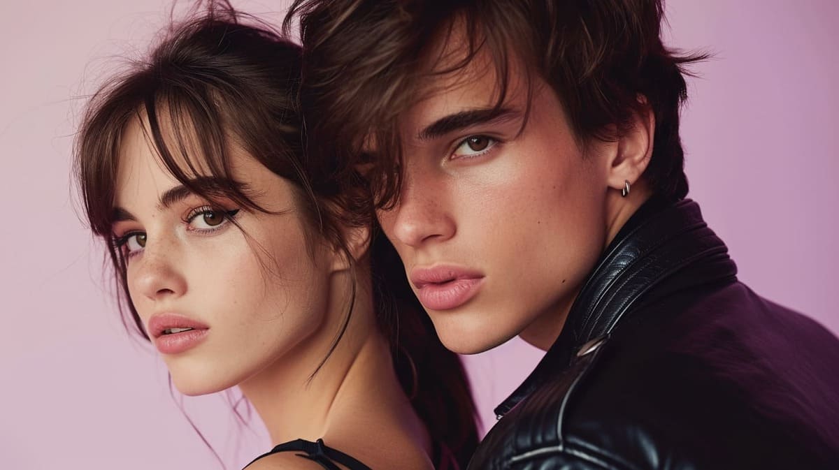 Fashionable young couple posing against a pink background with woman looking over her shoulder and man wearing a black leather jacket.